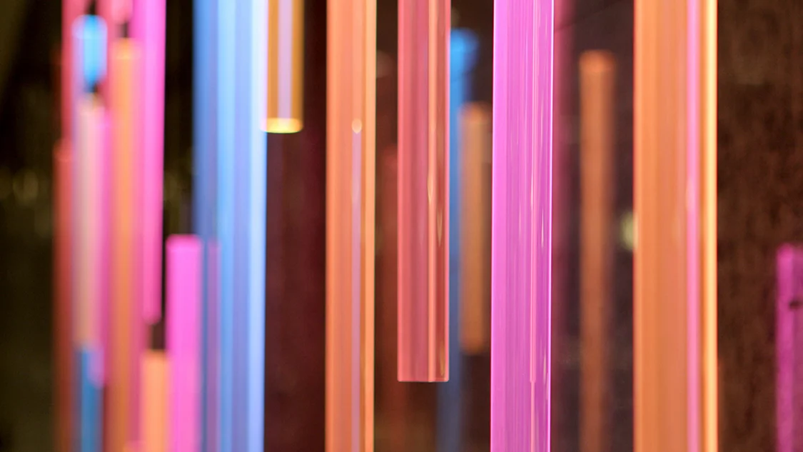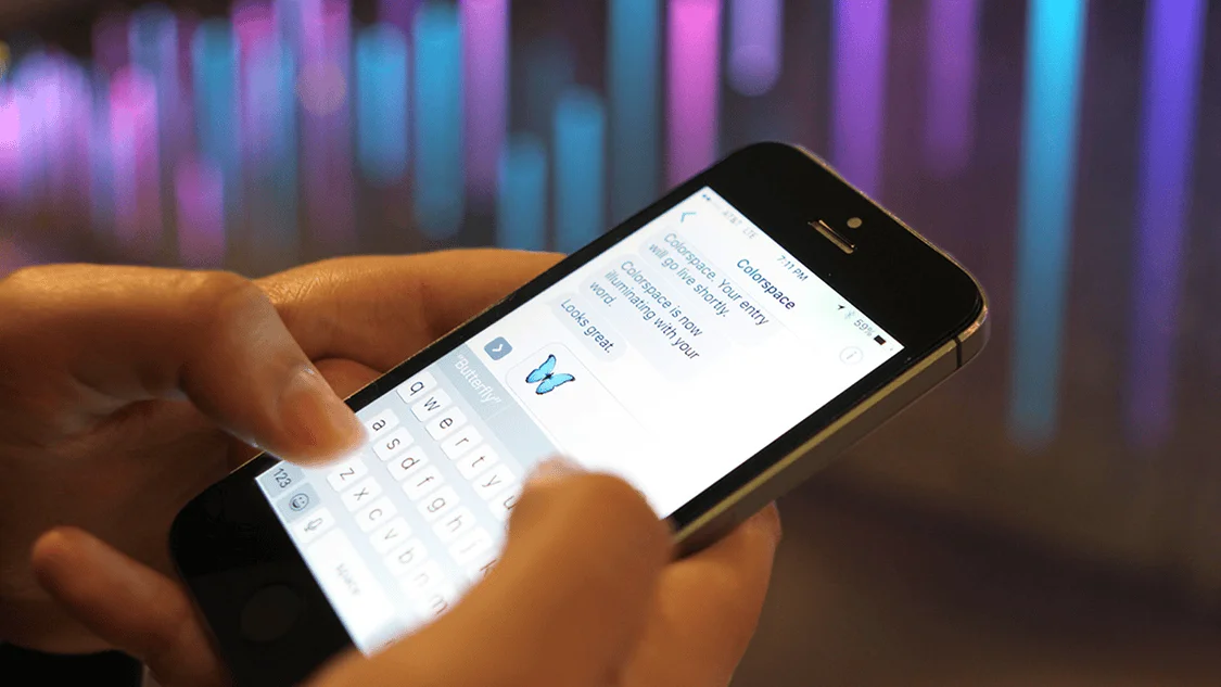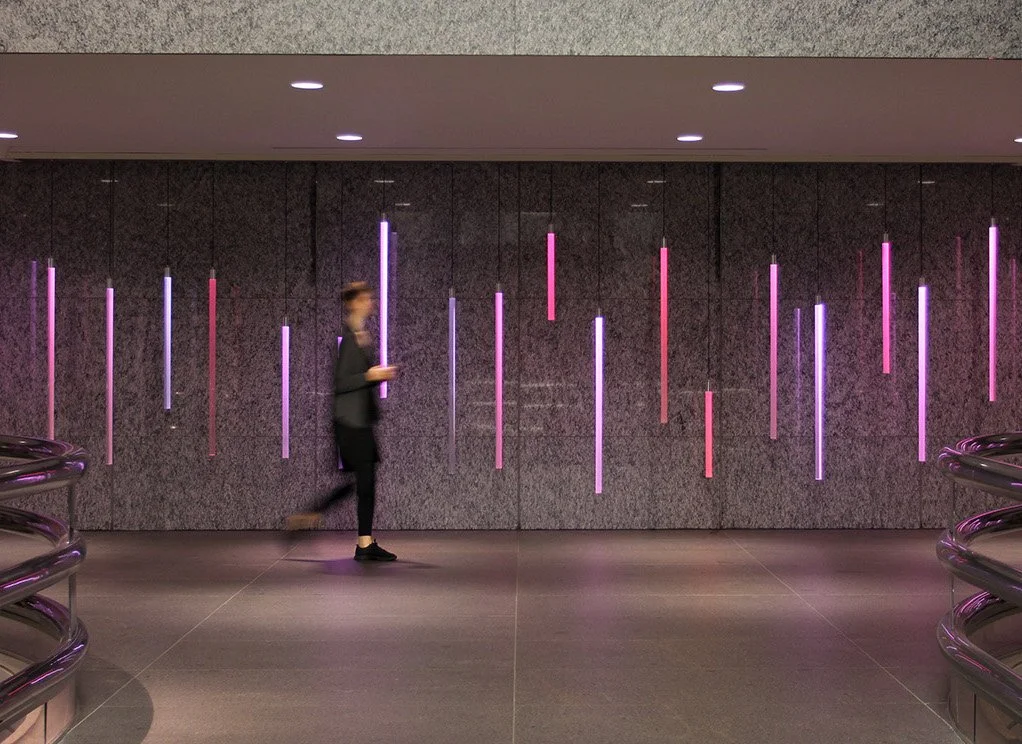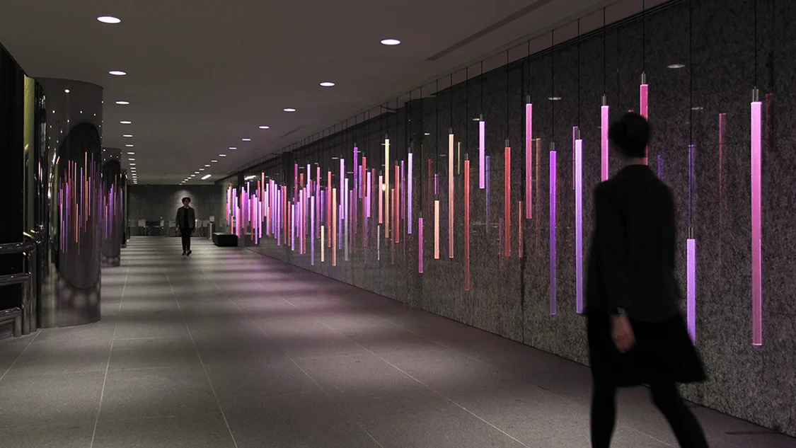 Colorspace is an interactive sculpture that translates text messages into animations of colored light. As people enter the space, they pass a long marble wall of suspended light pendants. Anybody can send a text message to the number printed on the wall. The sculpture replies with a sparkling wash of light that sweeps across the wall, illuminating the space with new colors.